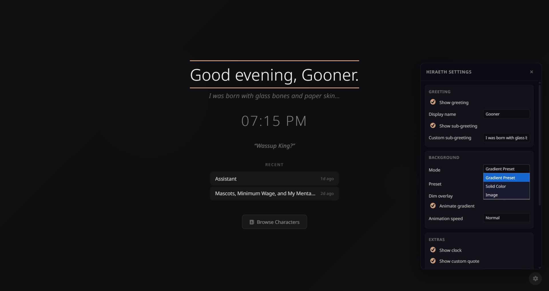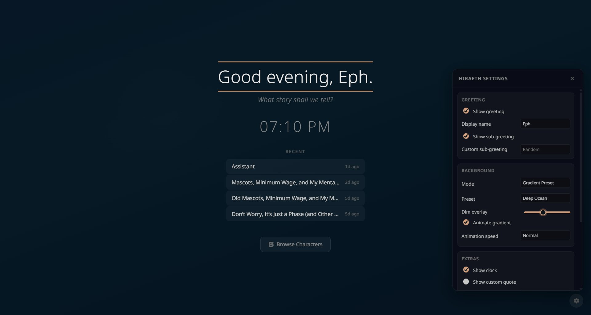 A mood board landing page for SillyTavern. Animated gradient backgrounds, time-aware greetings, recent chats, integrated character browser, and a frosted glass aesthetic.