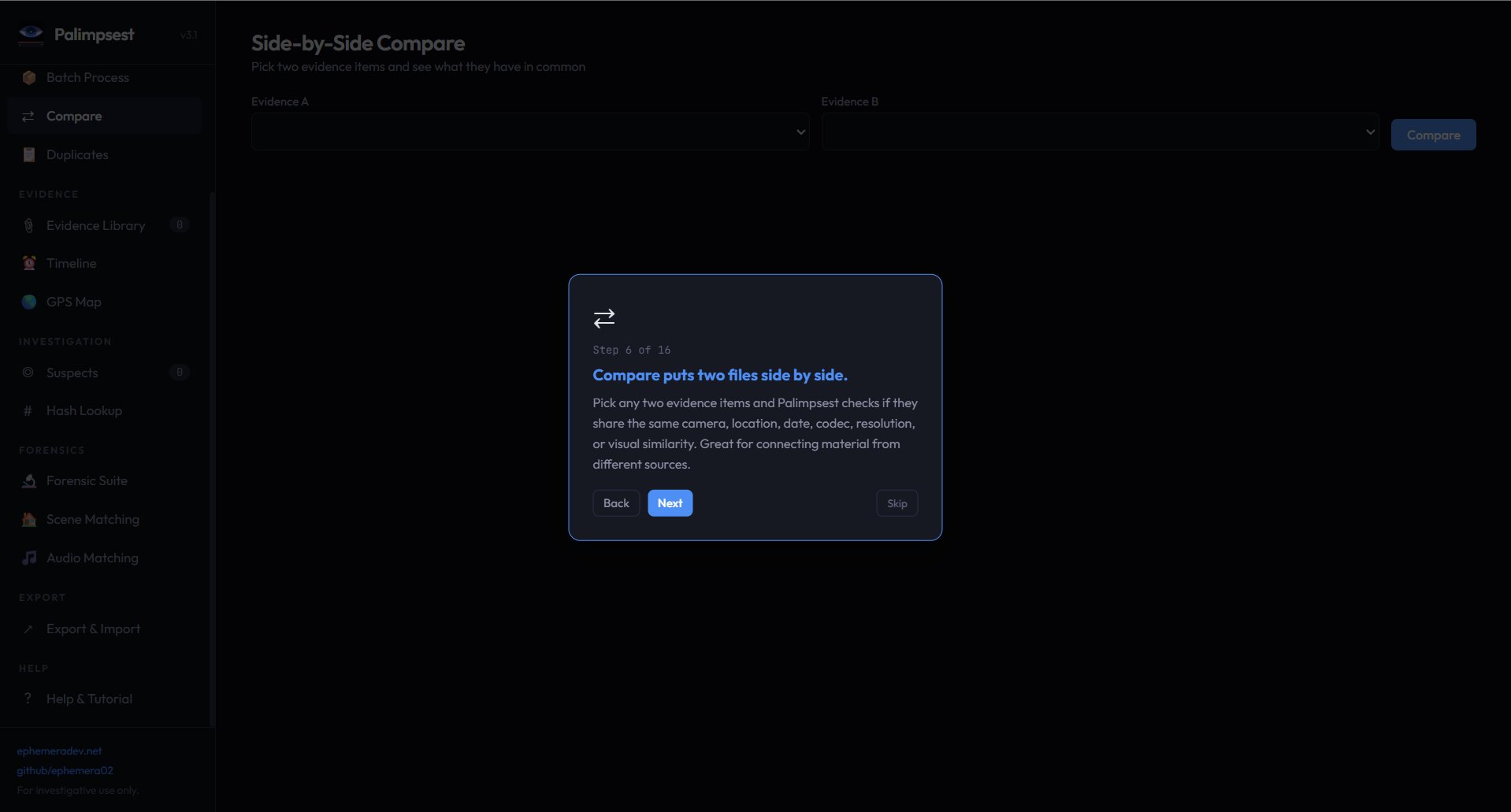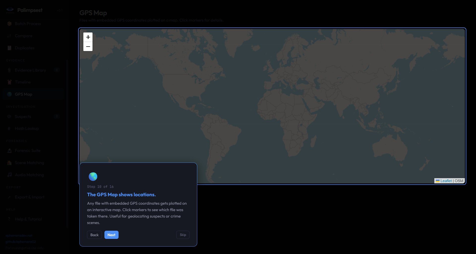 Metadata forensics toolkit. Extract hidden data from photos and videos, run deep forensic analysis with 6 modules, track suspects, and build evidence packages in 5 export formats.