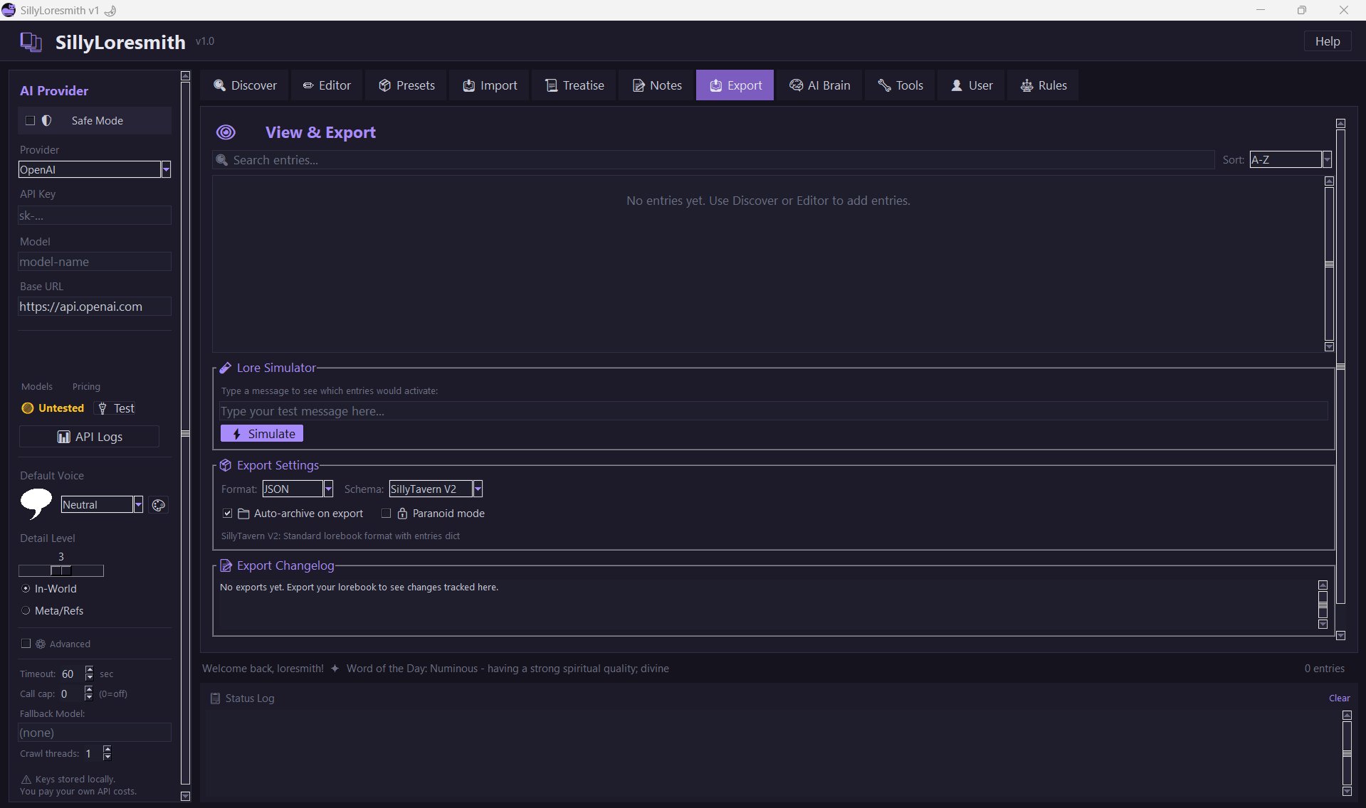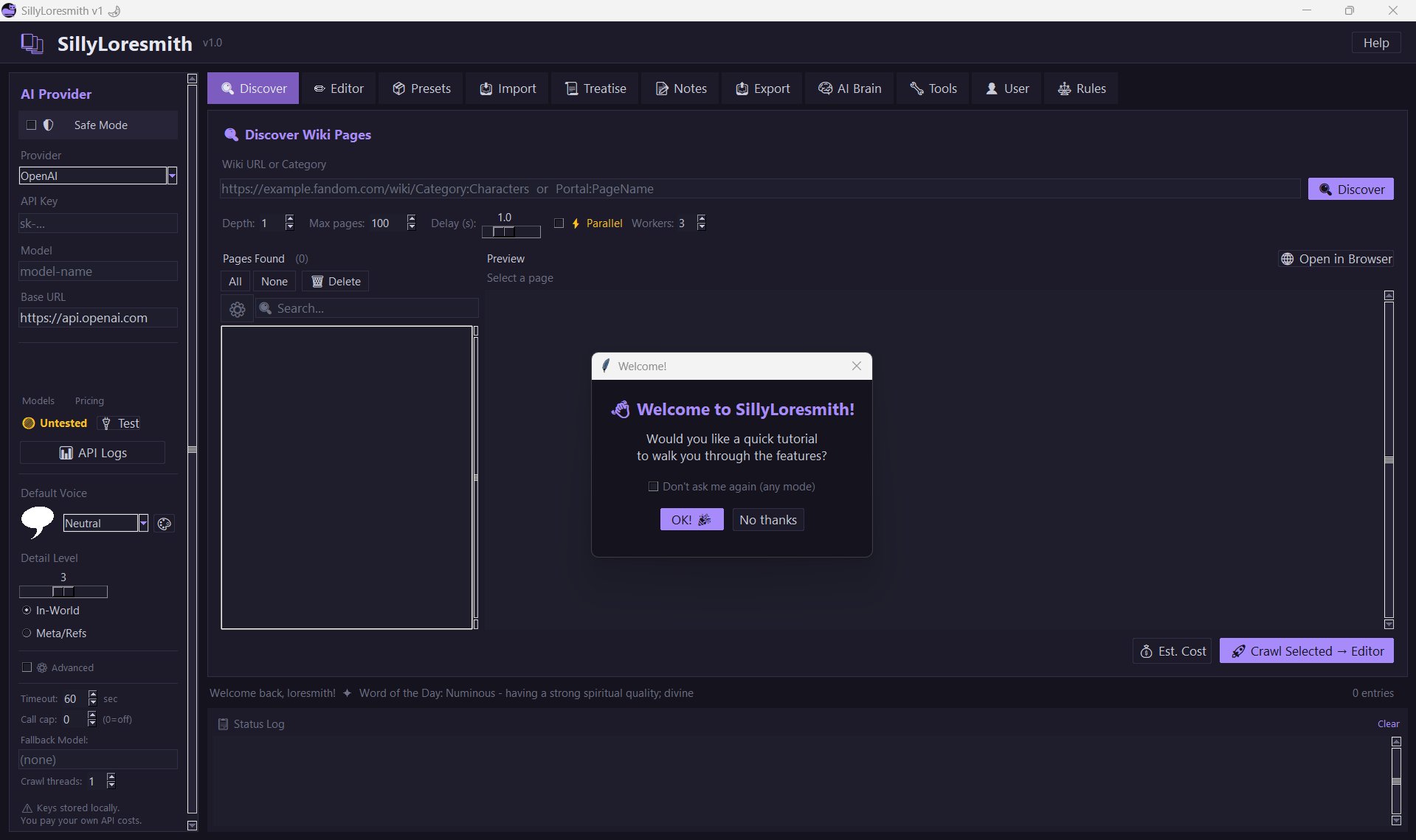 AI-powered lorebook builder for SillyTavern. Crawl wikis, summarize with AI, build structured lore entries with 8 voice styles and 5 providers. Full editor, AI Brain for auto-linking, 30+ theme colors.